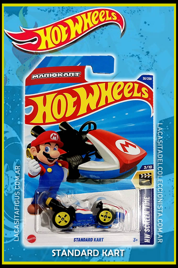 Breve historia: El STANDARD KART es un tipo de kart que apareció en la serie de videojuegos Mario Kart. Apareció por primera vez en Mario Kart DS y ha estado presente en todos los juegos de Mario Kart desde entonces, mientras que su diseño para la versión de Hot Wheels proviene de Mario Kart 8.