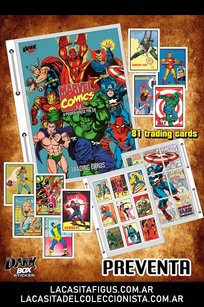 Si sos fan de Marvel, no podes podes perderte esto: A Power House Pin Up era una serie de imágenes que se encontraban en contratapas de comics y laminas individuales en los años 60 y 70. Hoy te traemos esta colección en formato de Trading Cards con dorsos de rompecabezas y un coleccionador para guardarlas!